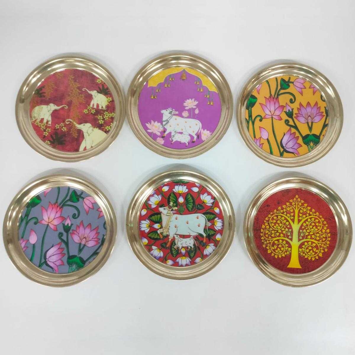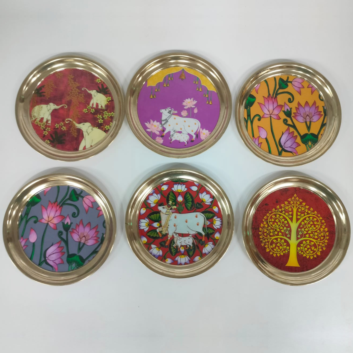 Bring home the charm of traditional art with this Pichwai Printed Brass Plate, designed as a lightweight Pooja Thali for rituals, décor, and gifting. Crafted from durable brass and adorned with elegant Pichwai artwork, this plate beautifully blends tradition with functionality. Its compact 8-inch size makes it easy to use for Pooja, Diwali celebrations, weddings, and as a unique return gift. Perfect for adding a touch of devotion and culture to your festive décor.