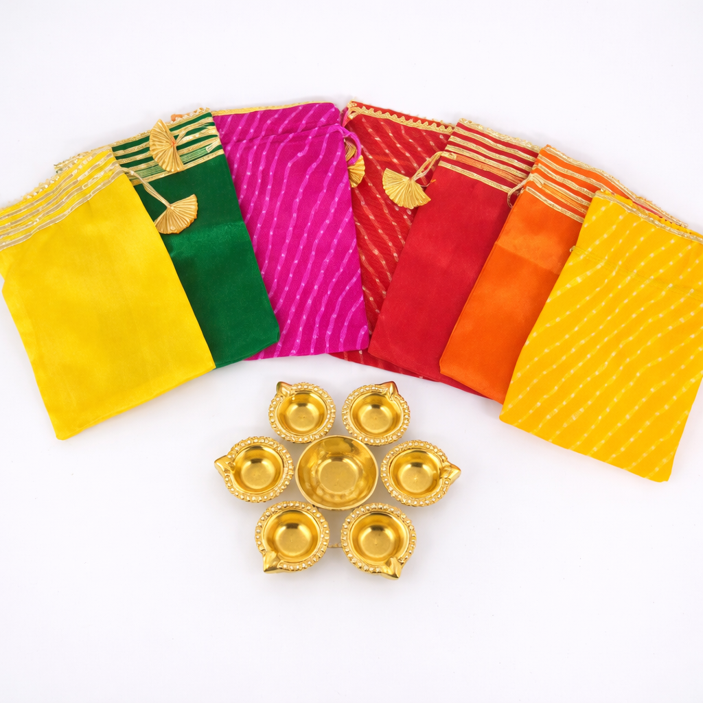 This elegant combo includes a set of brass finish metal diyas paired with a beautifully printed fabric potli featuring Radha Krishna artwork. Perfect for pooja rituals, Diwali celebrations, or as a thoughtful festive gift, this set brings together tradition and utility. The reusable potli adds a graceful touch, making it an ideal gifting choice for housewarmings, weddings, or festive occasions.