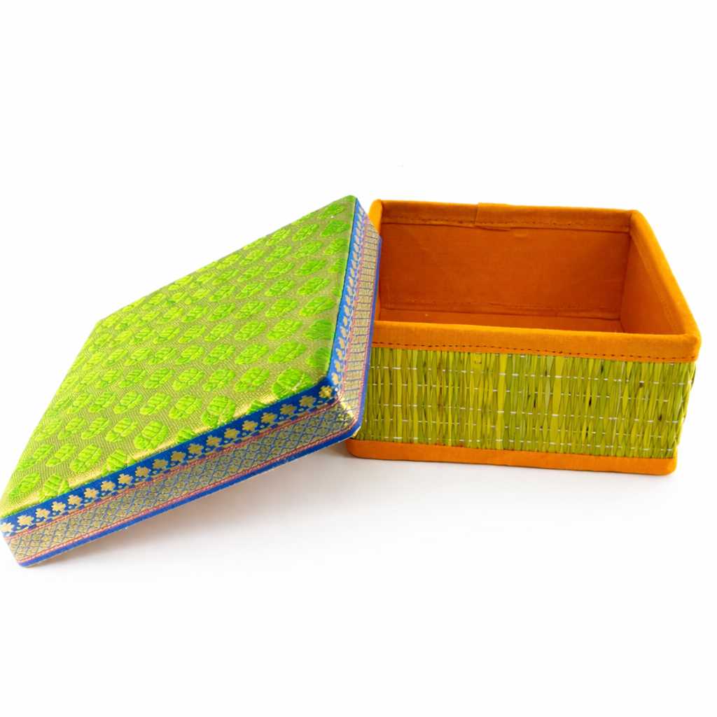Available in two convenient sizes, this box is lightweight, durable, and designed to make every occasion more special. Its intricate handwoven finish and elegant brocade detailing make it a timeless piece of Indian craftsmanship.