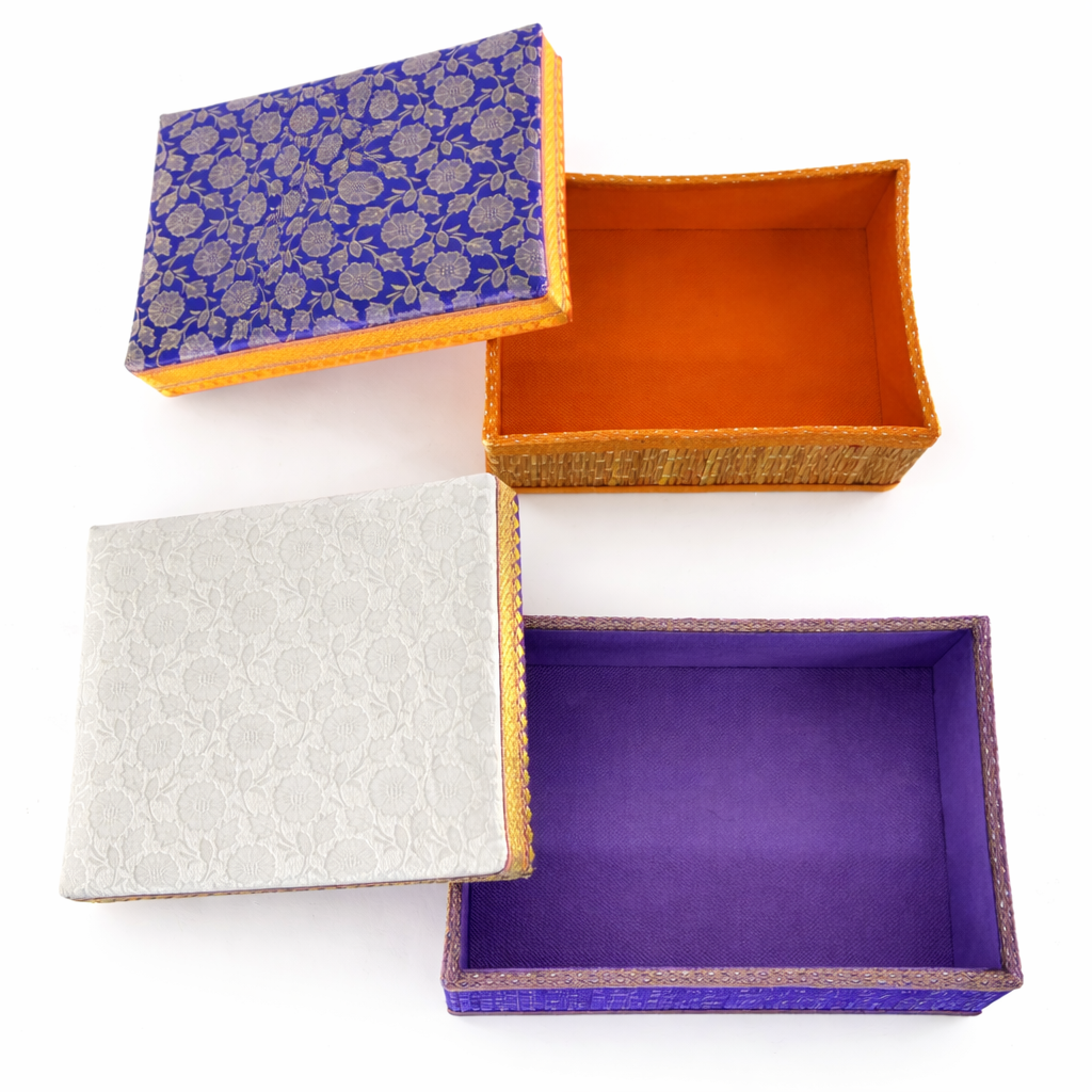 Available in two convenient sizes, this box is lightweight, durable, and designed to make every occasion more special. Its intricate handwoven finish and elegant brocade detailing make it a timeless piece of Indian craftsmanship.