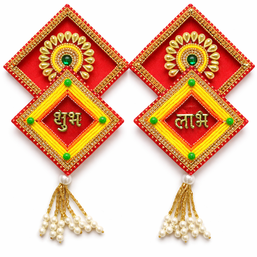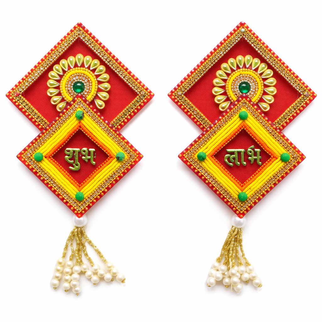 Elegant Shubh Labh wall hanging set in a double-diamond design, decorated with beads, pearls, and golden tassels. Perfect for welcoming positivity and auspiciousness at entrances, pooja rooms, and festive spaces during Diwali/Deepavali, Navratri, and weddings.