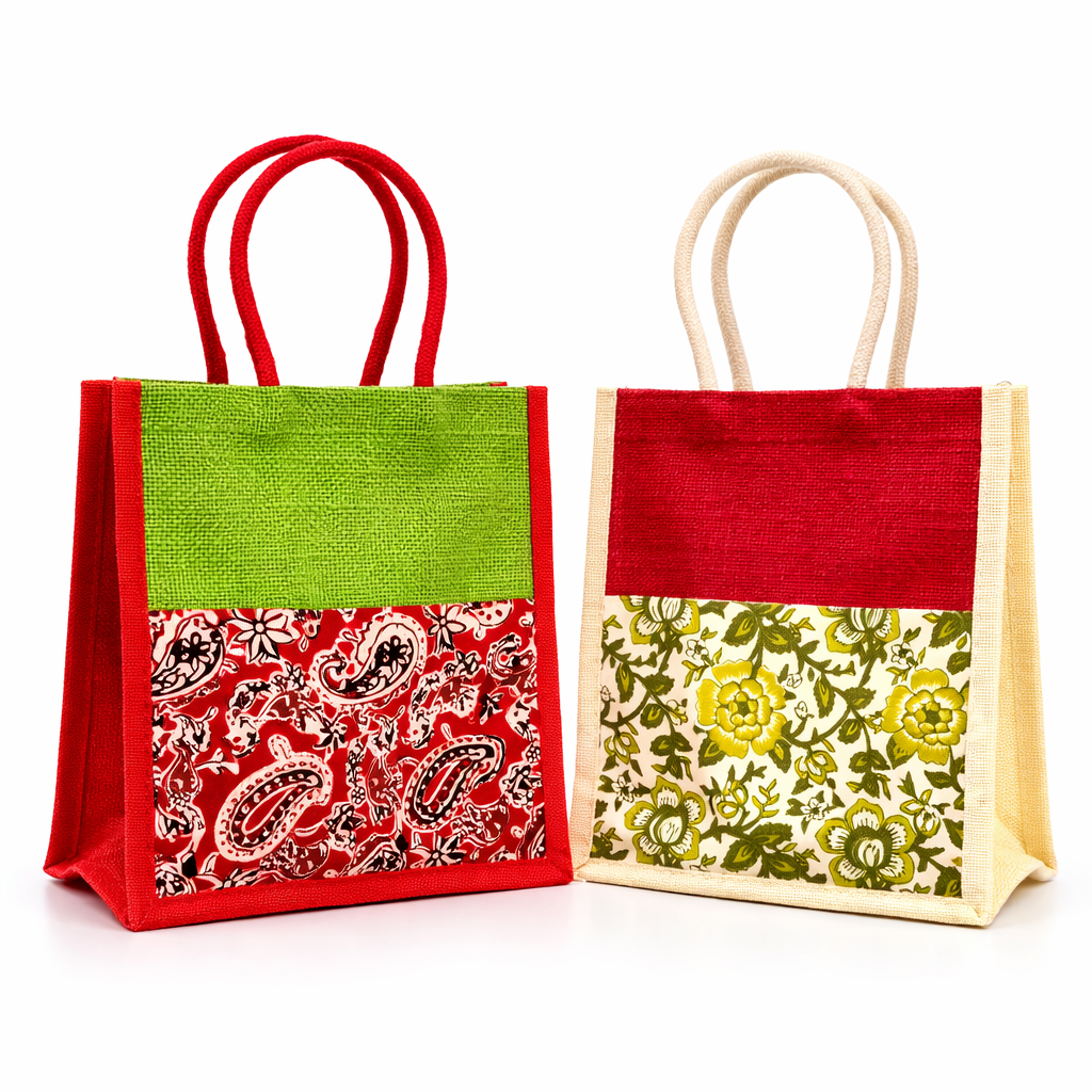 Dual-Tone Jute Bag with Printed Fabric Panel |Return Gift