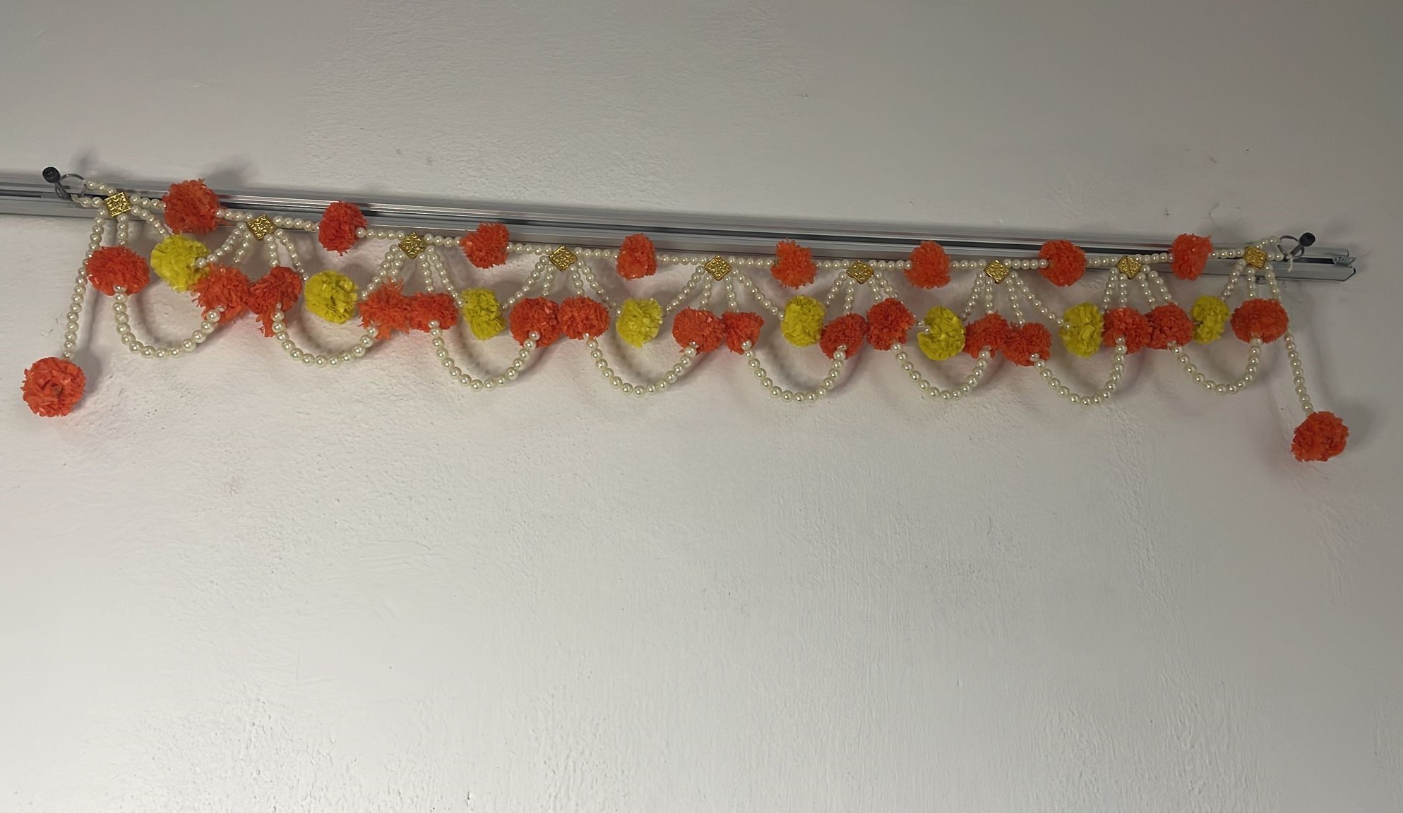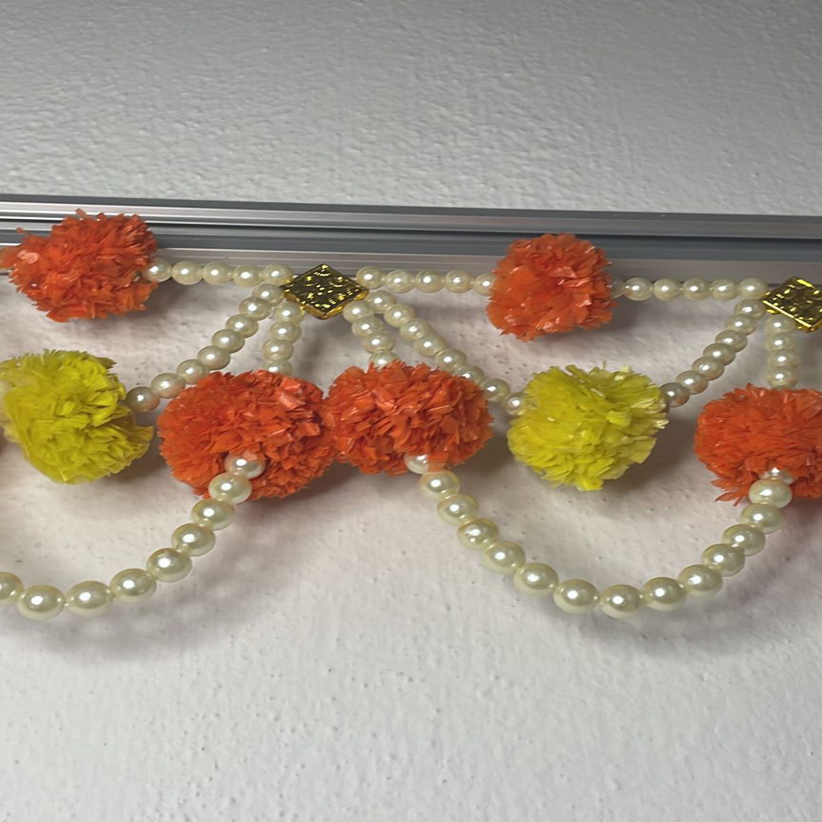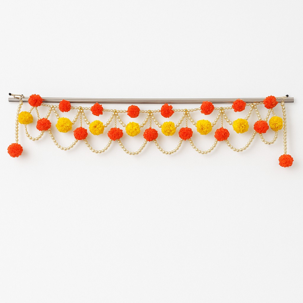Handcrafted decorative pom-pom toran featuring bright orange pom-poms, pink hanging accents, and golden beads with layered chains. Measuring 39 inches (3.25 ft), this festive piece is perfect for decorating entrances, pooja rooms, and special occasions like Diwali, Navratri, and weddings."
