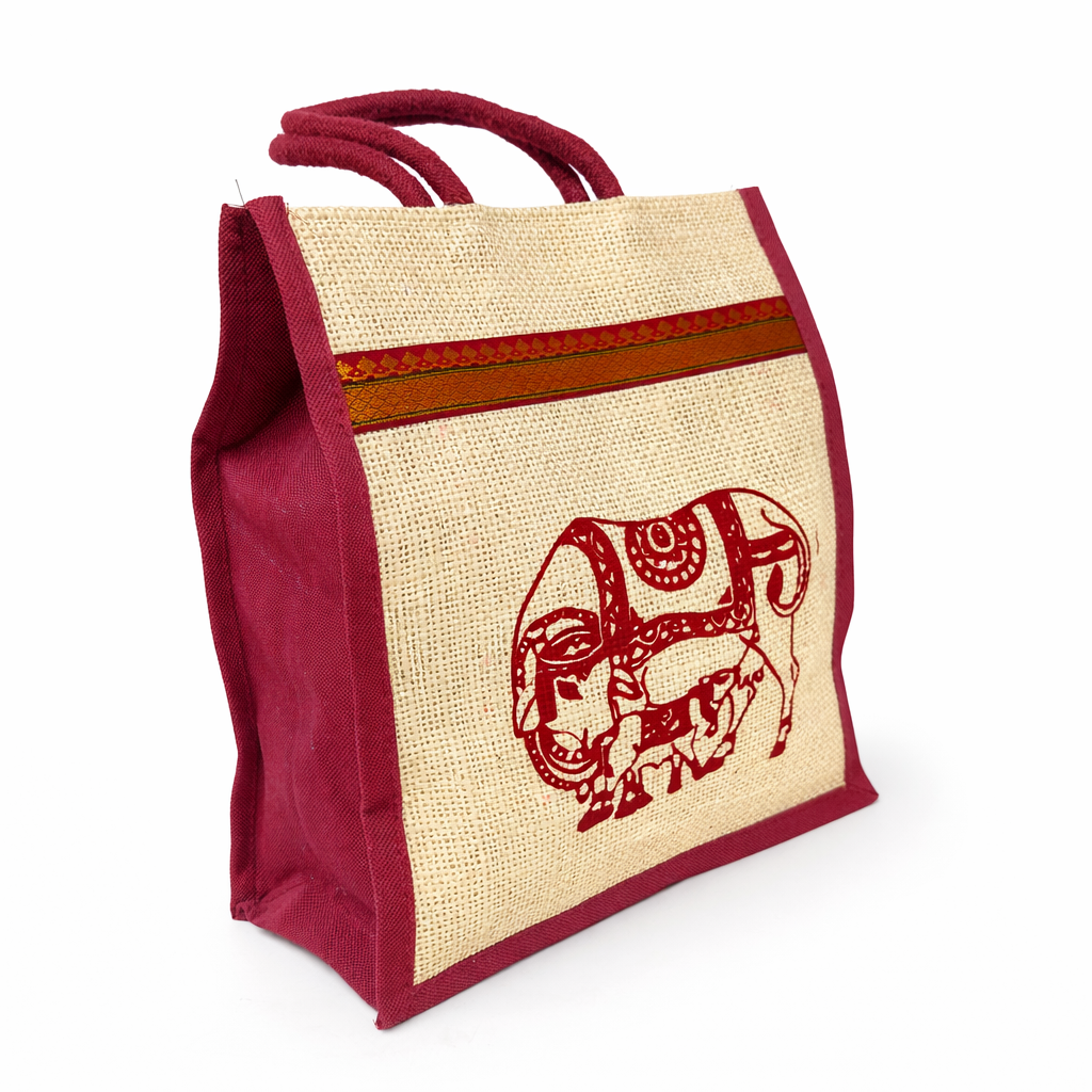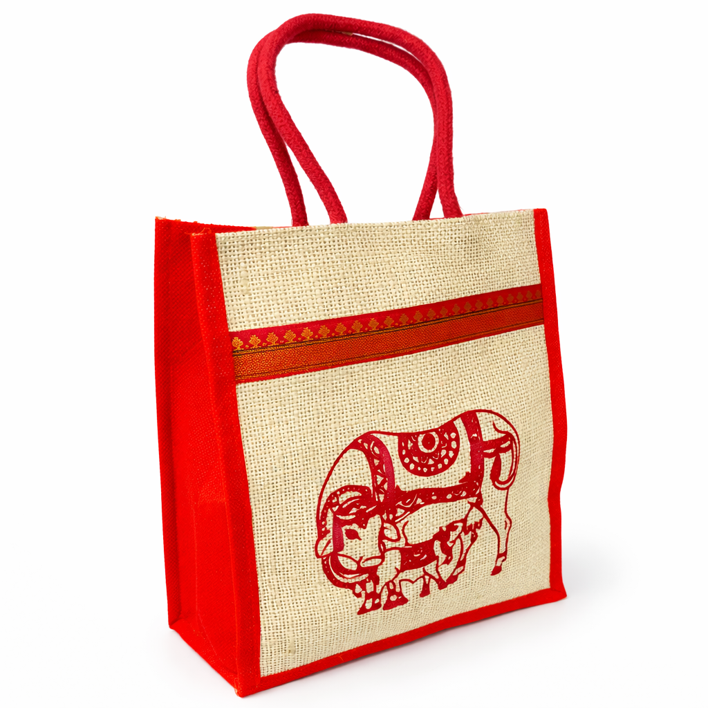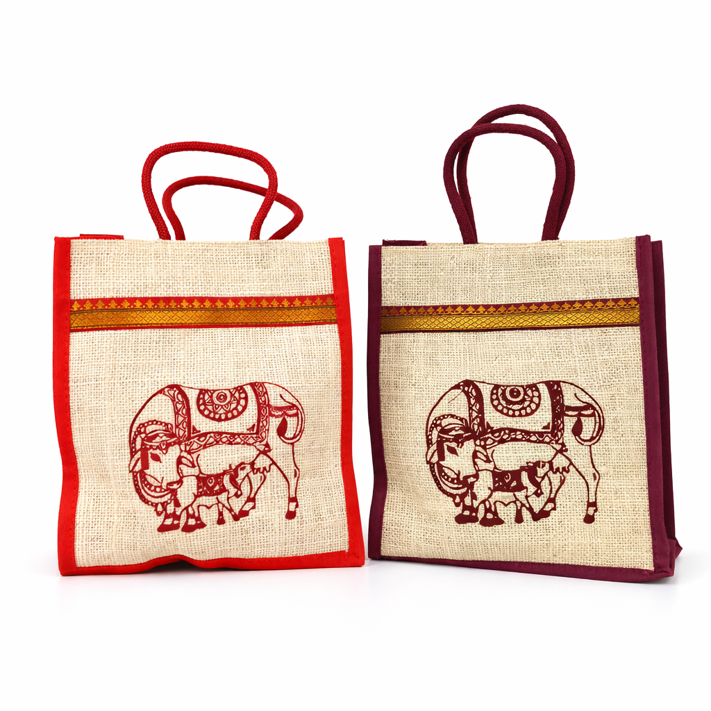 Bring elegance and tradition together with this Cow Print Jute Bag featuring a decorative zari border. Crafted from durable natural jute, this eco-friendly bag is perfect for return gifts at weddings, pooja ceremonies, baby showers, and festive occasions. Its compact yet spacious size, along with sturdy handles, makes it practical for daily use while adding a cultural and stylish touch to your gifting.