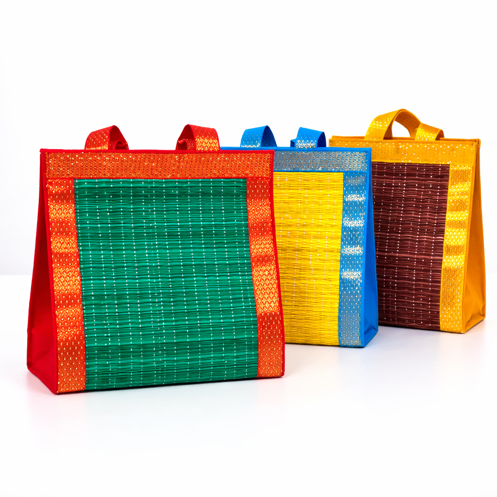 Bring home the charm of tradition with this handcrafted Korai grass carry bag, woven by artisans with natural grass and finished with a rich zari border. Lightweight yet durable, this eco-friendly bag is perfect for return gifts, festive hampers, weddings, and pooja essentials. Designed with a Velcro closure, it combines traditional weaving with modern practicality.