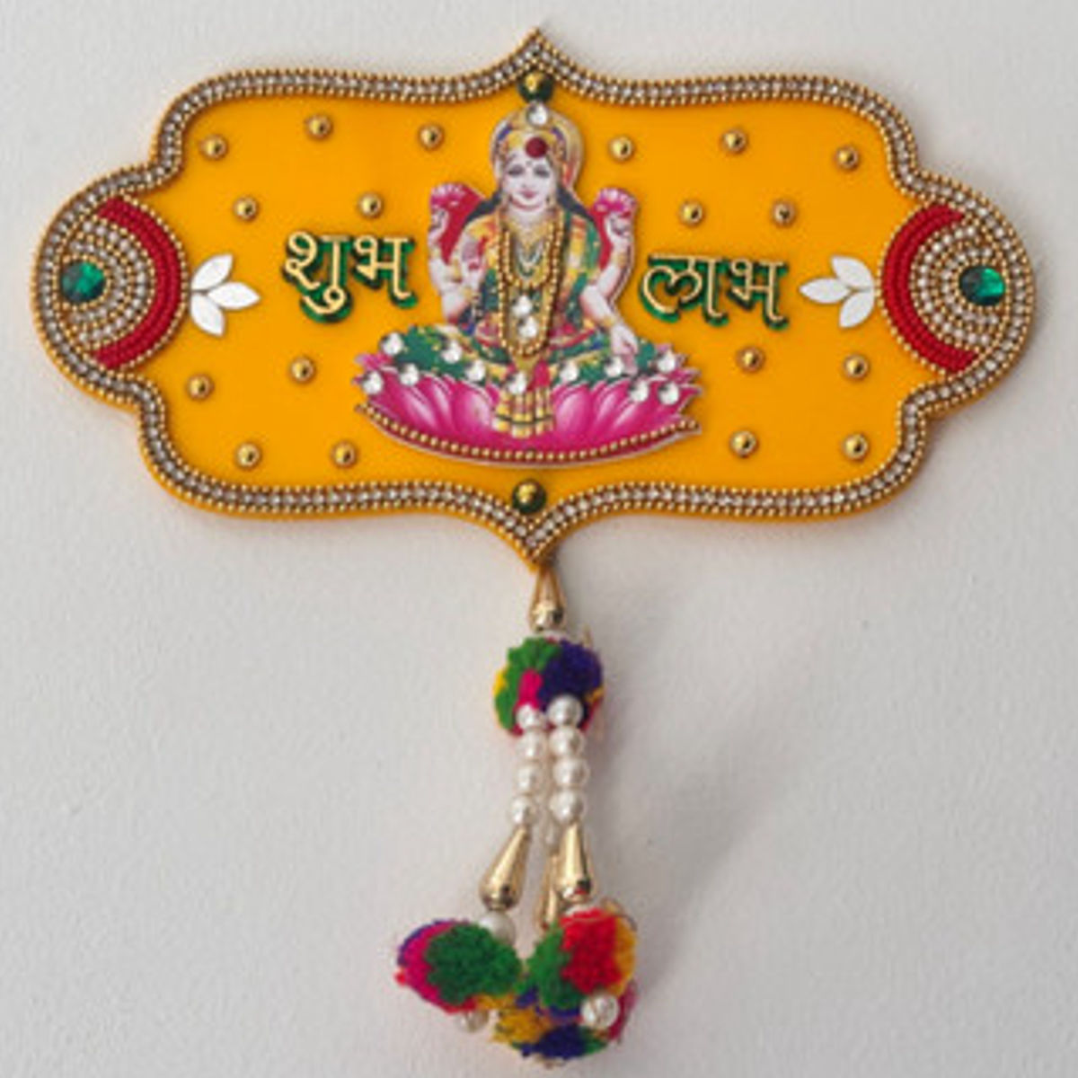 Auspicious Shubh Labh wall hanging featuring Goddess Lakshmi on a bright plaque base, decorated with beads, stones, and colorful pom-pom tassels. Ideal for adorning doorways, pooja rooms, and walls during Diwali/Deepavali, weddings, and festive occasions.