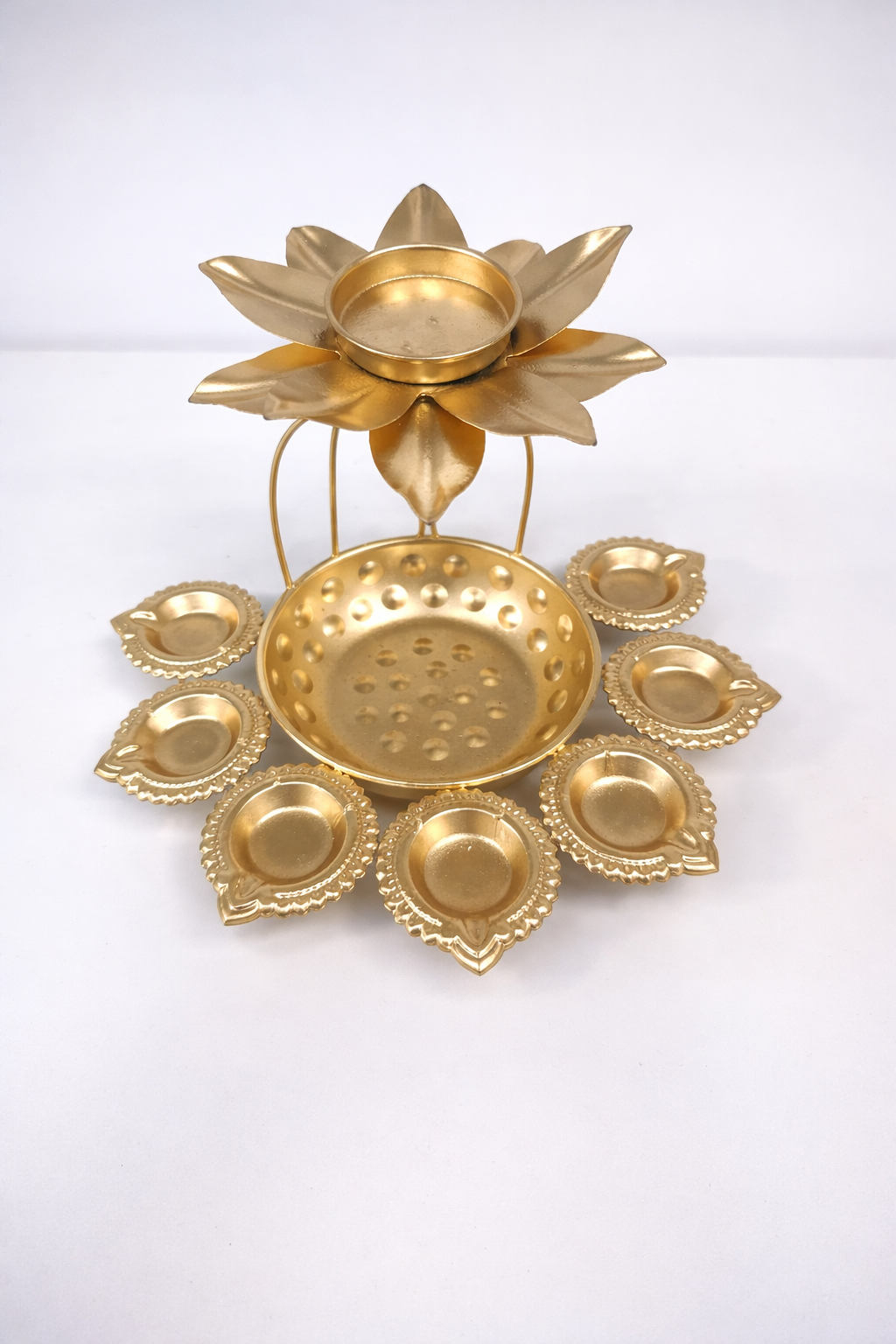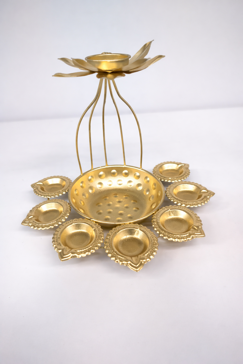 Designed primarily for Diwali and festive celebrations, this lotus diya stand creates a warm, inviting ambiance when illuminated. The gentle glow of diyas enhances the intricate contours of the metal, casting soft reflections that elevate the décor of living spaces, entrances, or prayer areas. Beyond festive use, it can also serve as a year-round decorative element, adding a touch of cultural elegance to homes, offices, or boutique interiors.