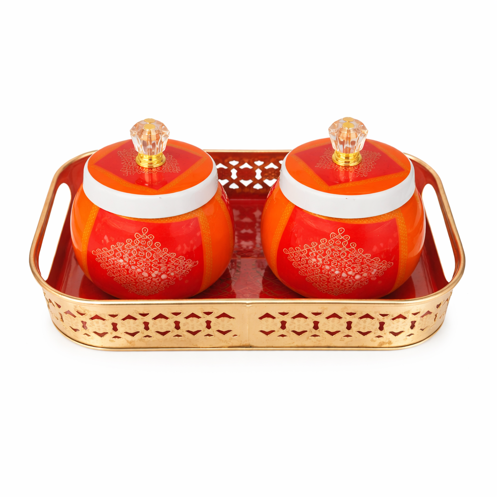 Add a touch of traditional elegance to your home with this Pichwai Printed Decorative Metal Tray and Jar Set. Featuring vibrant and intricate Pichwai artwork, this lightweight metal tray and jar make a perfect addition to festive décor, pooja setups, gifting hampers, and return gifts. The compact size makes it ideal for holding sweets, dry fruits, pooja items, or small décor pieces. Its bright and artistic design instantly enhances the ambience of any room or festive arrangement.