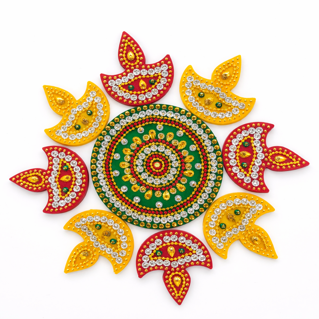 Handcrafted acrylic rangoli featuring a compact 9-piece design with studded stone embellishments. Measuring approx. 8 inches, this decorative rangoli is ideal for enhancing pooja corners, Diwali/Deepavali décor, weddings and festive gifting.