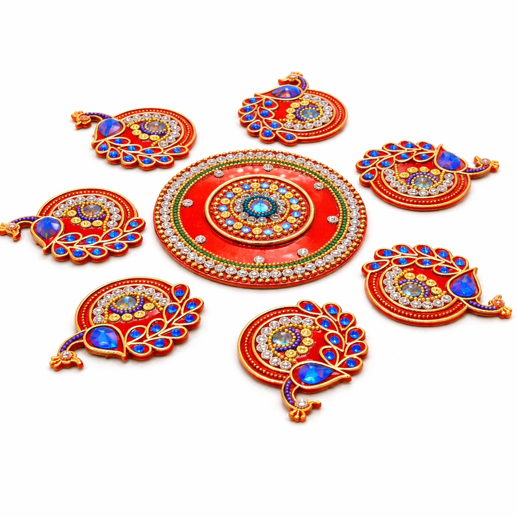 Handcrafted acrylic rangoli set featuring a bright red central circle surrounded by blue peacock-shaped side mats. Decorated with colorful stones, beads and glitter accents, this 8-piece set is perfect for pooja rooms, Diwali/Deepavali celebrations, weddings and festive décor.