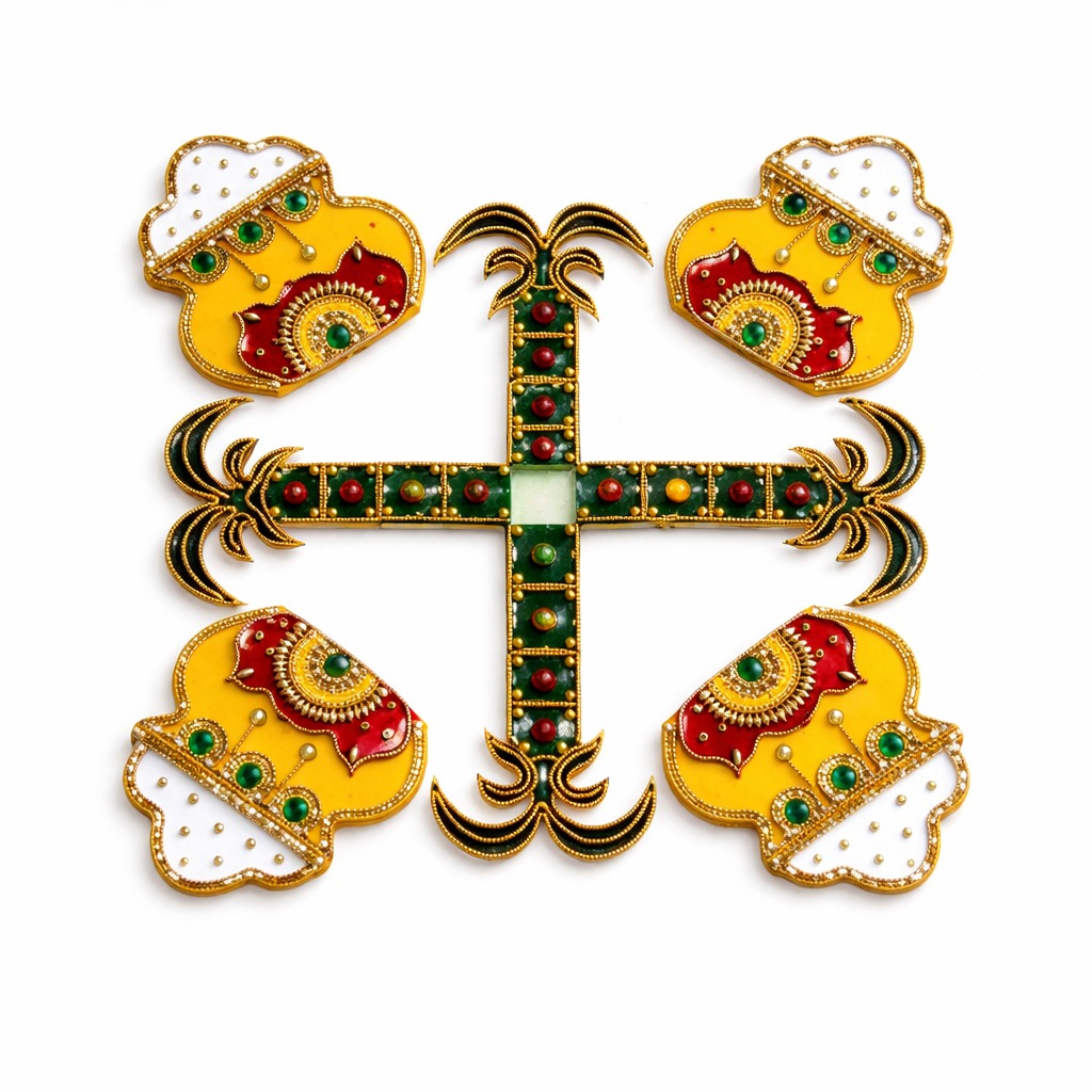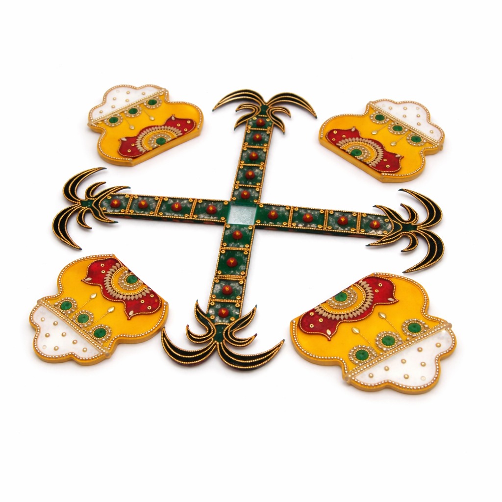Carefully handcrafted using quality acrylic material, this rangoli showcases refined craftsmanship and attention to detail. The acrylic base offers strength and durability while allowing intricate decorative elements to be presented with clarity and balance. Each piece carries subtle variations that highlight its handmade nature, ensuring that no two rangolis are exactly alike. The smooth surface and sturdy structure make it suitable for repeated use without losing its aesthetic appeal.