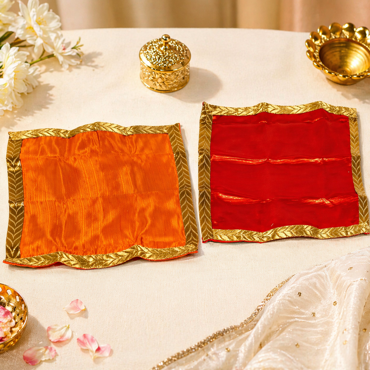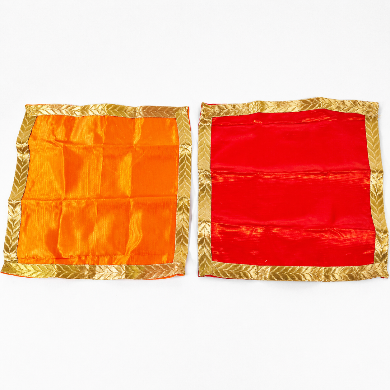 Grab this Silk Finish Pooja Aasan Mat Set with Gold Border in red & orange. Ideal for pooja, aarti, and festive decor. Lightweight, reusable, value pack of 2. Clearance sale – limited stock!